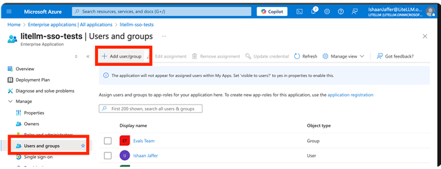 Once you've selected your litellm app, click on Users and Groups > Add user/group